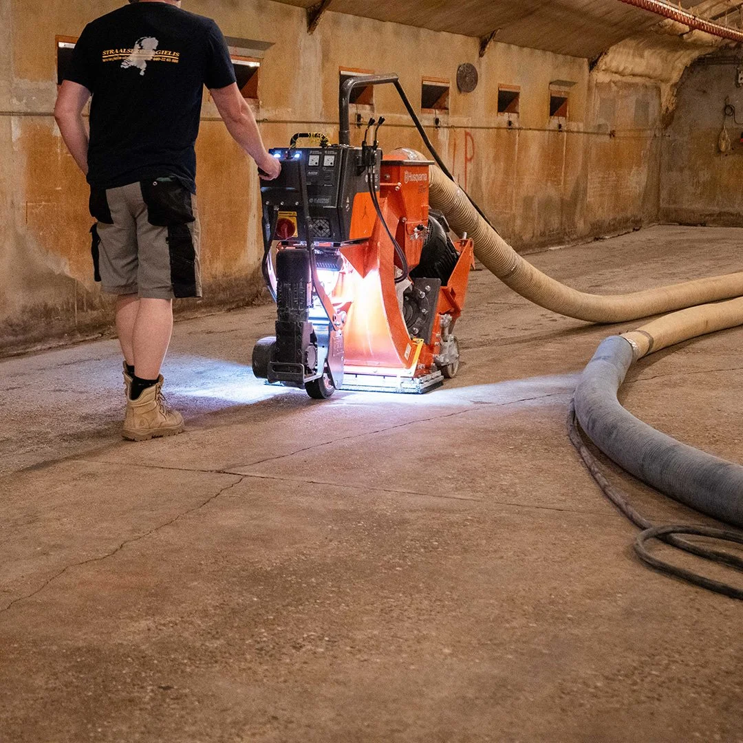 The existing floor is mechanically shot blasted to remove dirt and irregularities and to create optimal adhesion.